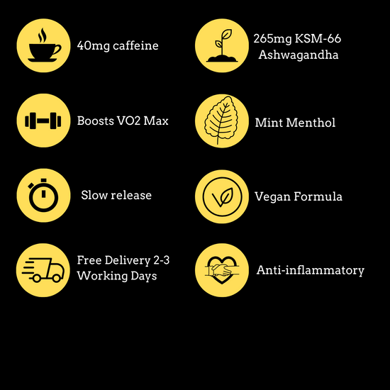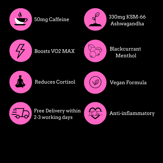 All the power of The Podum Finish Plus lozenge in a tasty Blackcurrant menthol flavour. With the clinically backed KSM-66 Ashwagandha and 50mg of Caffeine in a 5g piece, the Podium Finish Plus lozenges slow release formula ensures a steady release of our active compounds. Perfect for endurance sport or to counteract all kinds of tiredness of fatigue.
