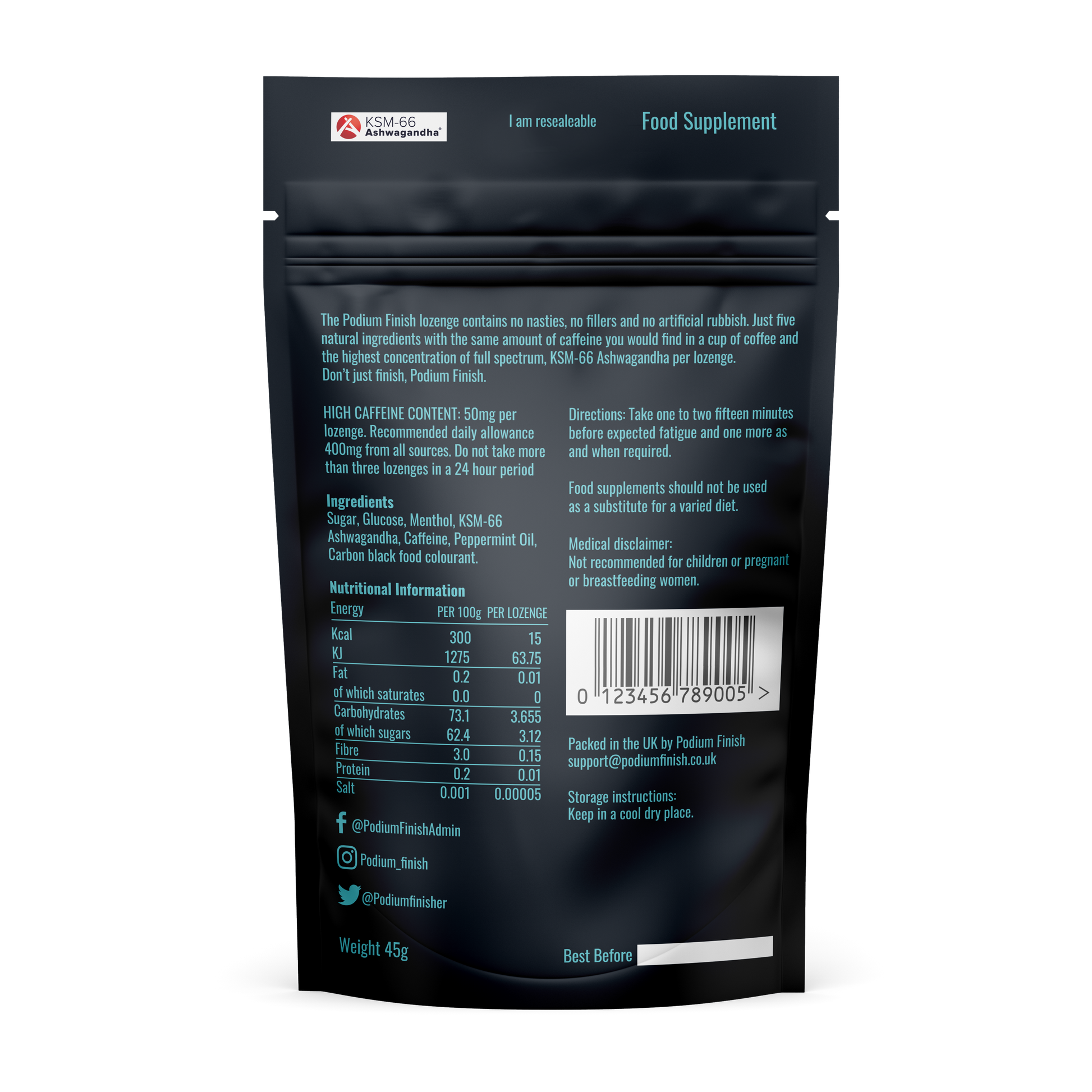 Podium Finish Plus is the ultimate sports nutrition supplement. Our energy mints use the most bio-available and clinically backed KSM-66 ashwagandha, alongside a solid hit of caffeine to enhance energy reserves and deliver post workout recovery. Perfectly designed for runners and cyclists, we top the podium in a mint menthol, vegan-friendly formula with a potent blast of menthol to help increase oxygen intake.